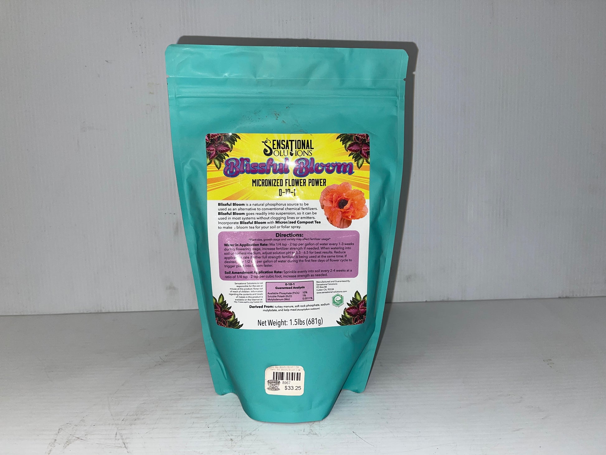 Sensational Solutions crafted a micronized blend of natural ingredients to encourage bulky and aromatic flowers and fruits. Blissful Bloom is a natural phosphorus source to be used as an alternative to conventional chemical fertilizers. Blissful Bloom goes readily into suspension, so it can be used in most systems without clogging lines or emitters. Incorporate Blissful Bloom with Micronized Compost Tea to make a bloom tea for your soil or foliar spray.