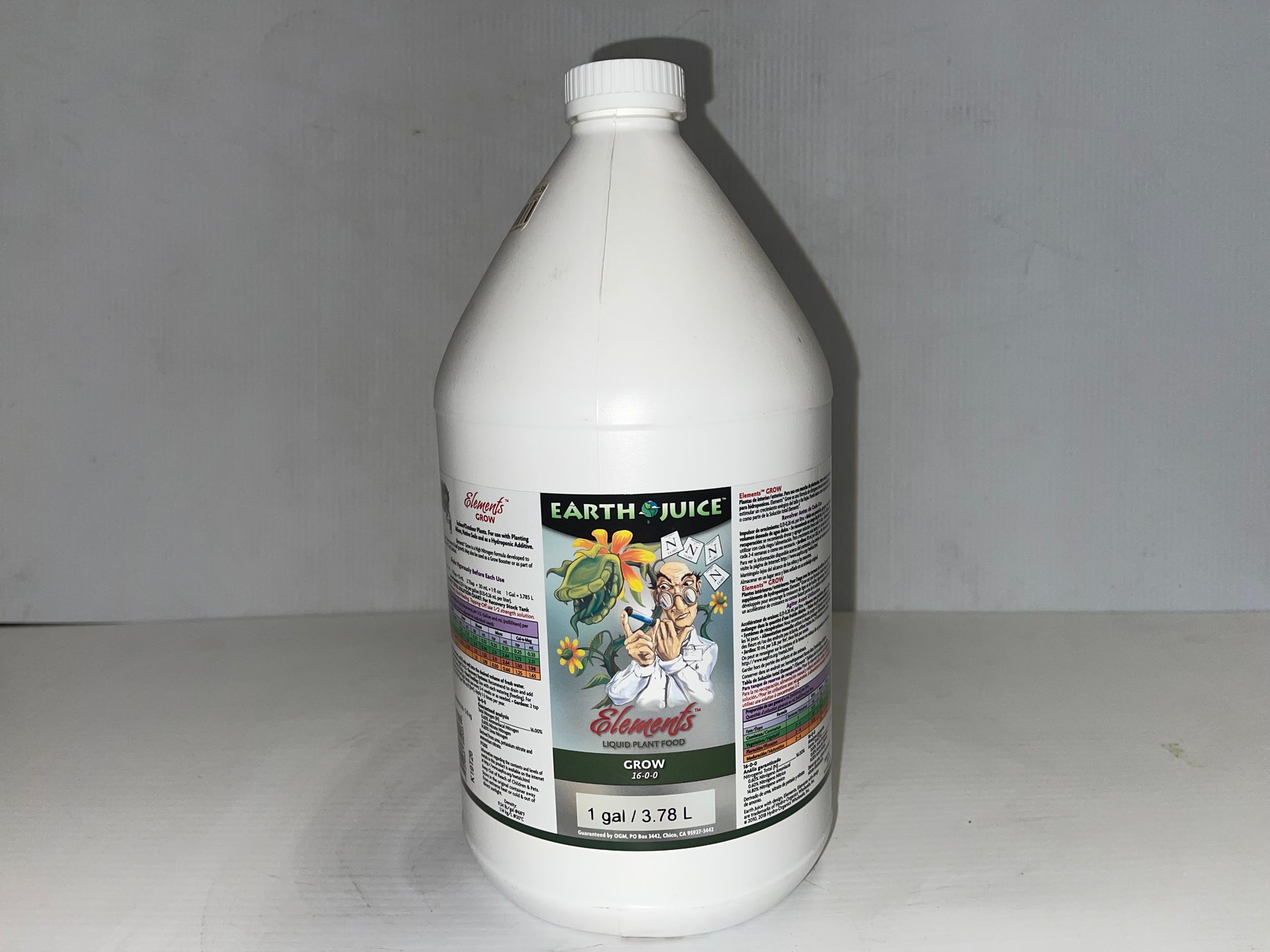 Earth Juice Elements Grow Liquid “High Nitrogen” formula develops and supports vigorous stem and leaf growth Versatile and easy to use Can be used as a grow booster or as part of the “Elements” Total Multi-Part Nutrient System For use on indoor/outdoor plants in soil or hydroponic systems