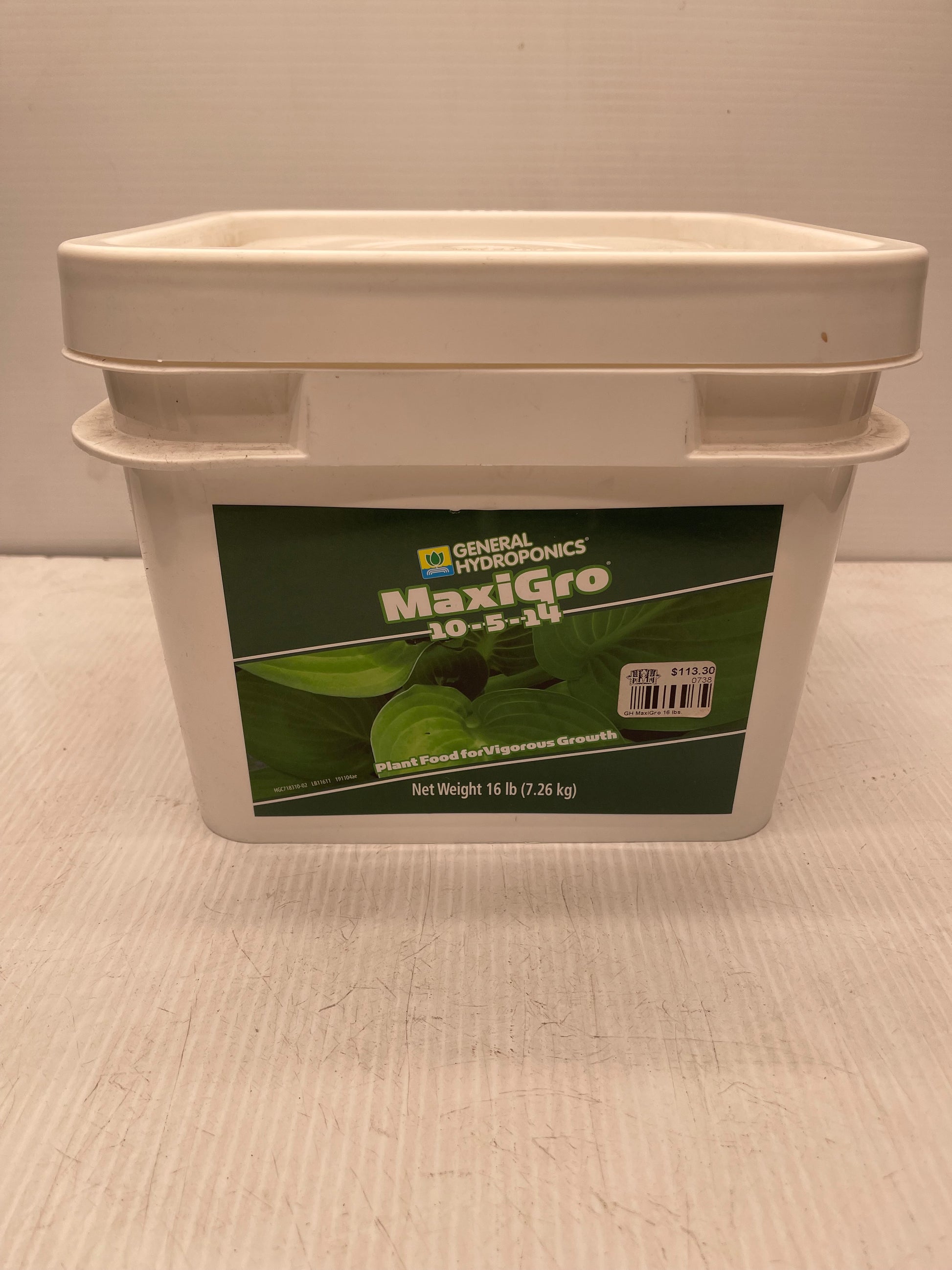 General Hydroponics® MaxiGro™ 10 - 5 - 14 MaxiGro™ and MaxiBloom™ are extremely potent, stand-alone, water-soluble, dry concentrate nutrients. Complete in primary, secondary and micronutrients, pH buffered MaxiGro™ and MaxiBloom™ will provide superior results when used with a wide variety of crops in both hydroponic and soil-based environments. MaxiGro™ encourages growth of seedlings, cuttings and stimulates rapid growth through the vegetative growth stage.