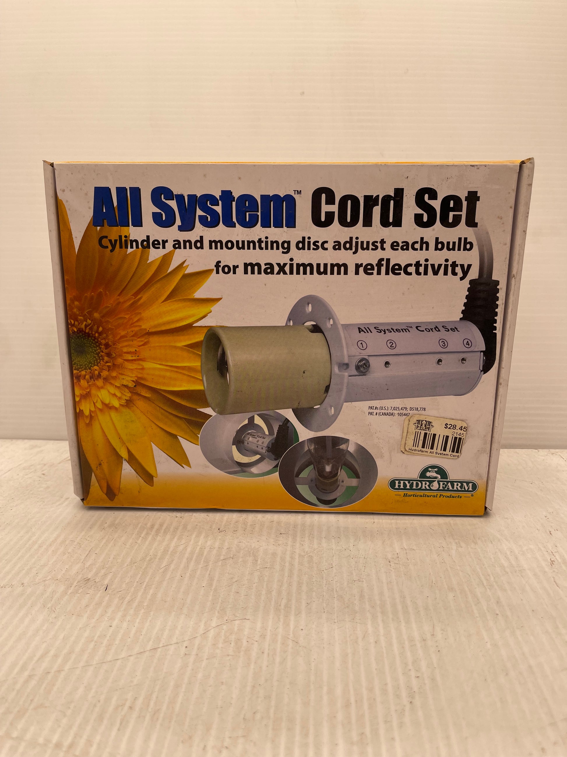 Hydrofarm All-System Cord Set We start with a 6KV pulse rated position-oriented mogul socket - the highest rating of any socket on the market. The socket is mounted on our patented All System cylinder and mounting disc which adjusts each bulb for maximum reflectivity. Then we add our new molded right angle strain relief and 15 feet of heavy duty 600 volt rated cable to our patented waterproof Lock & Seal plug system. All-in-one design works with all ballast wattages No external reflector brackets required Works for all Hydrofarm reflectors