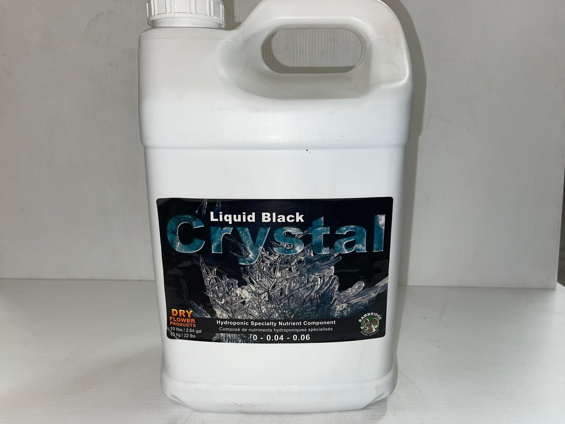 Liquid Black Crystal 0 - 0.04 - 0.06 Liquid Black Crystal assists in increasing the ion exchange across the root membrane. It improves the plants ability to absorb nutrients. Liquid Black Crystal must be put into your reservoir or used as a substrate drench. It is most effective when it is applied to the root zone of a plant. DO NOT foliar spray with Liquid Black Crystal directly onto leaf tissue.