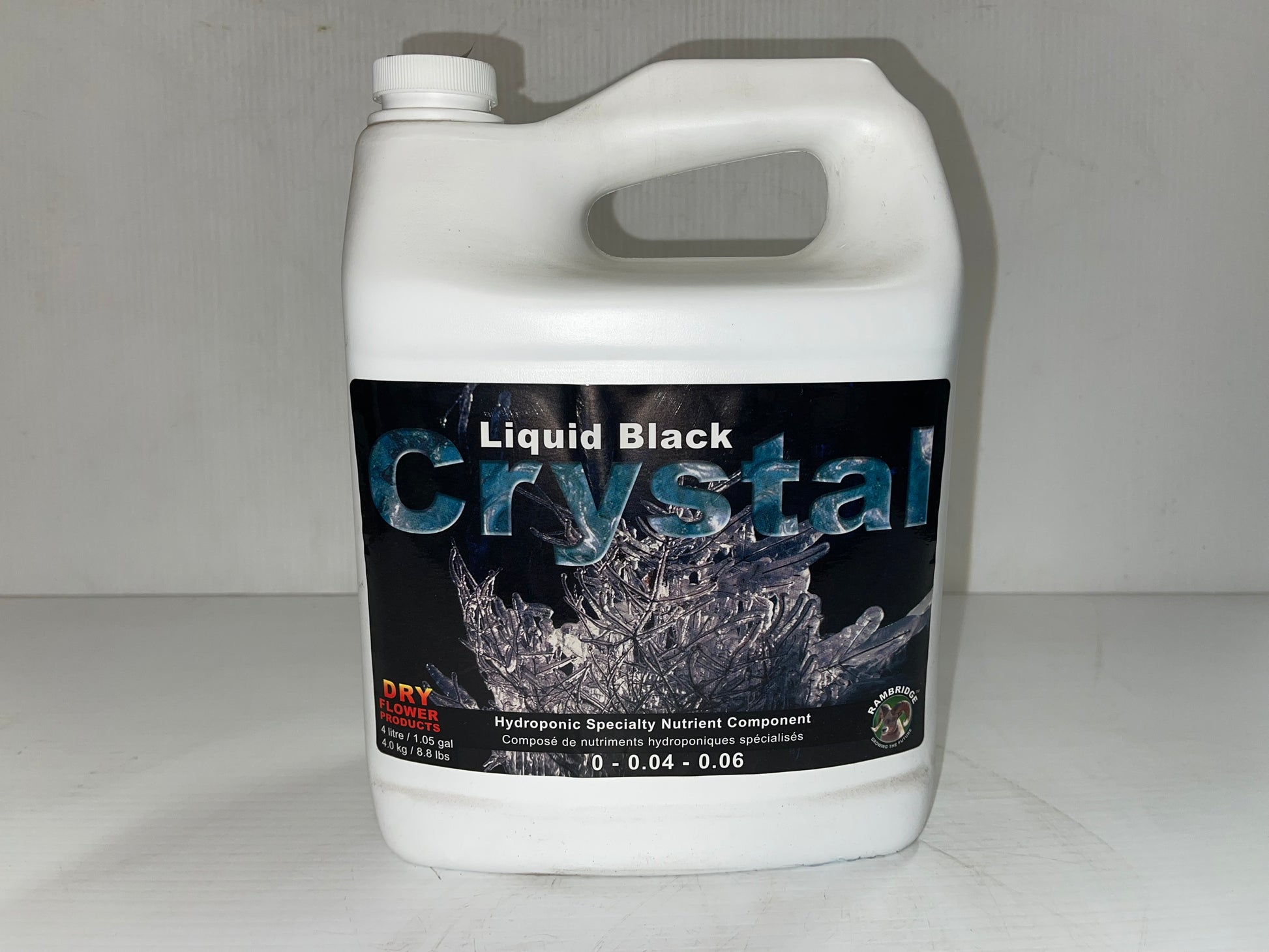 Liquid Black Crystal 0 - 0.04 - 0.06 Liquid Black Crystal assists in increasing the ion exchange across the root membrane. It improves the plants ability to absorb nutrients. Liquid Black Crystal must be put into your reservoir or used as a substrate drench. It is most effective when it is applied to the root zone of a plant. DO NOT foliar spray with Liquid Black Crystal directly onto leaf tissue.