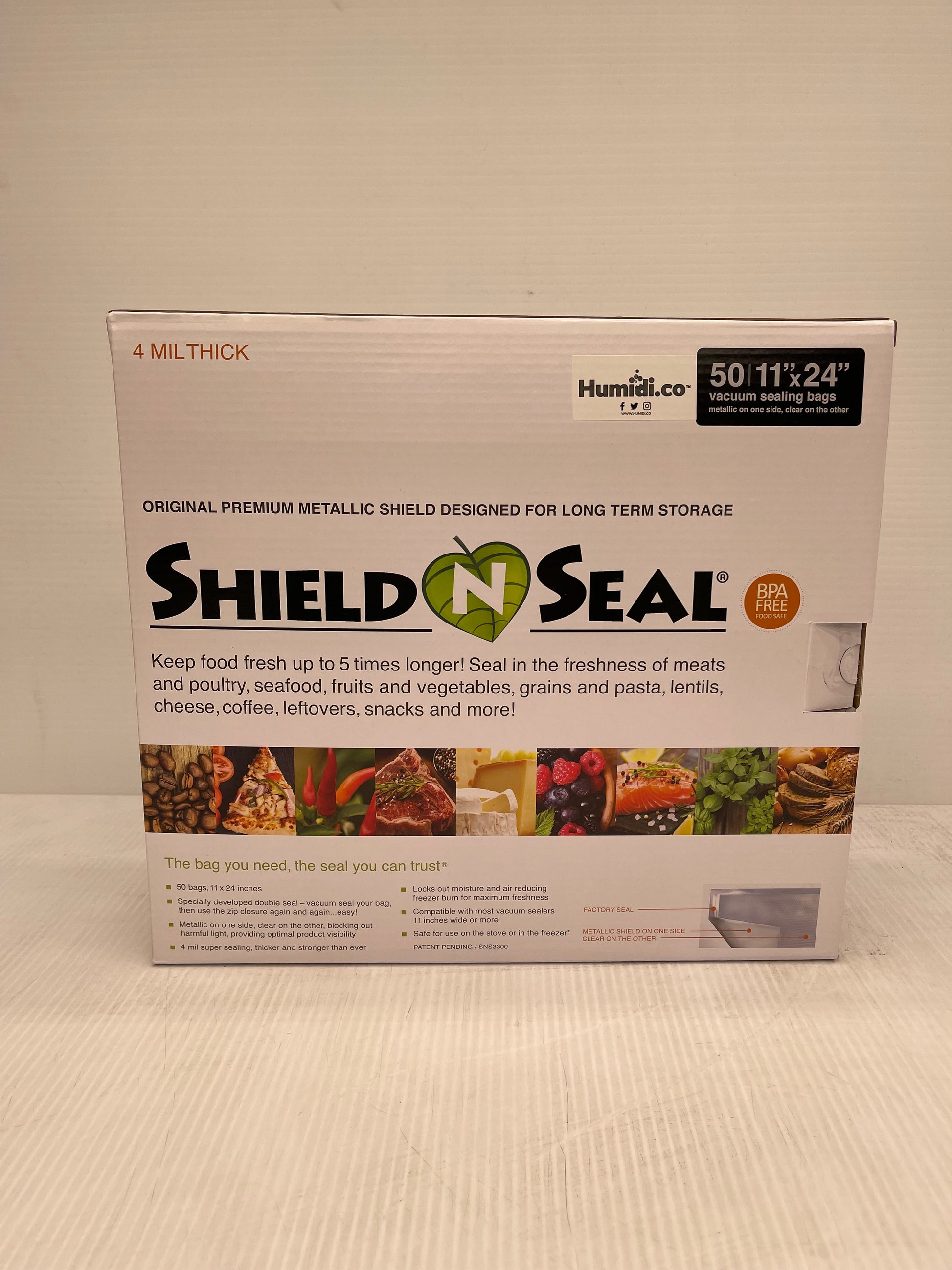 Clear and Metallic Vacuum Seal Bags Box Contents: 50 vacuum seal bags Size: 11″ x 24″ Material: 4 Mil, BPA Free Metallic and Clear Plastic Shield N Seal’s premium metallic heat seal bags are designed for long term storage. These bags are 4 Mil, BPA free, food grade metallic and clear vacuum sealer bags. Studies have shown that properly vacuum sealed food can stay fresh up to 5x longer, sometimes 10x longer. BPA free means that you can cook with confidence. You can sous vide your favorite recipes, boil in bag at any temperature knowing that our materials are food safe. They will not affect the flavor of the food, nor will they leach toxins that will harm your family. Your meal will retain its taste, texture, aroma, and nutritional value. Metallic vacuum seal bags are perfect for any type of food stuff; meat, chicken, fish, produce, and even coffee, tea, and herbs are kept amazingly fresh when sealed in these bags. We’ve made our new bags stronger and thicker than ever before, making sure that they lock out moisture and air. They reduce freezer burn better than any other bag we’ve tested. And while it locks in flavor, it will also lock in odor. You don’t have to worry about strong smells emanating from a Shield N Seal bag. Pungent food or garden odors are locked in tight, for good. Clear and Metallic construction allows for supreme versatility. Some times people like to be able to see their food through the clear side, and other times, it is better to have your bags be light proof. To protect from light and sun, simply double bag, flipping one bag around. Viola, light proof and double bagged! Don’t forget to reuse your Heat seal bags! Just trim off the rough edge, and reseal. It’s simple to save money by not only saving money on food, but also on the bags themselves. Our bags feature a honeycomb channel system that makes them compatible with most sealers that are 12″ or wider. We recommend using our Sealers for the strongest, thickest seal, but our bags can be used with a variety of systems.