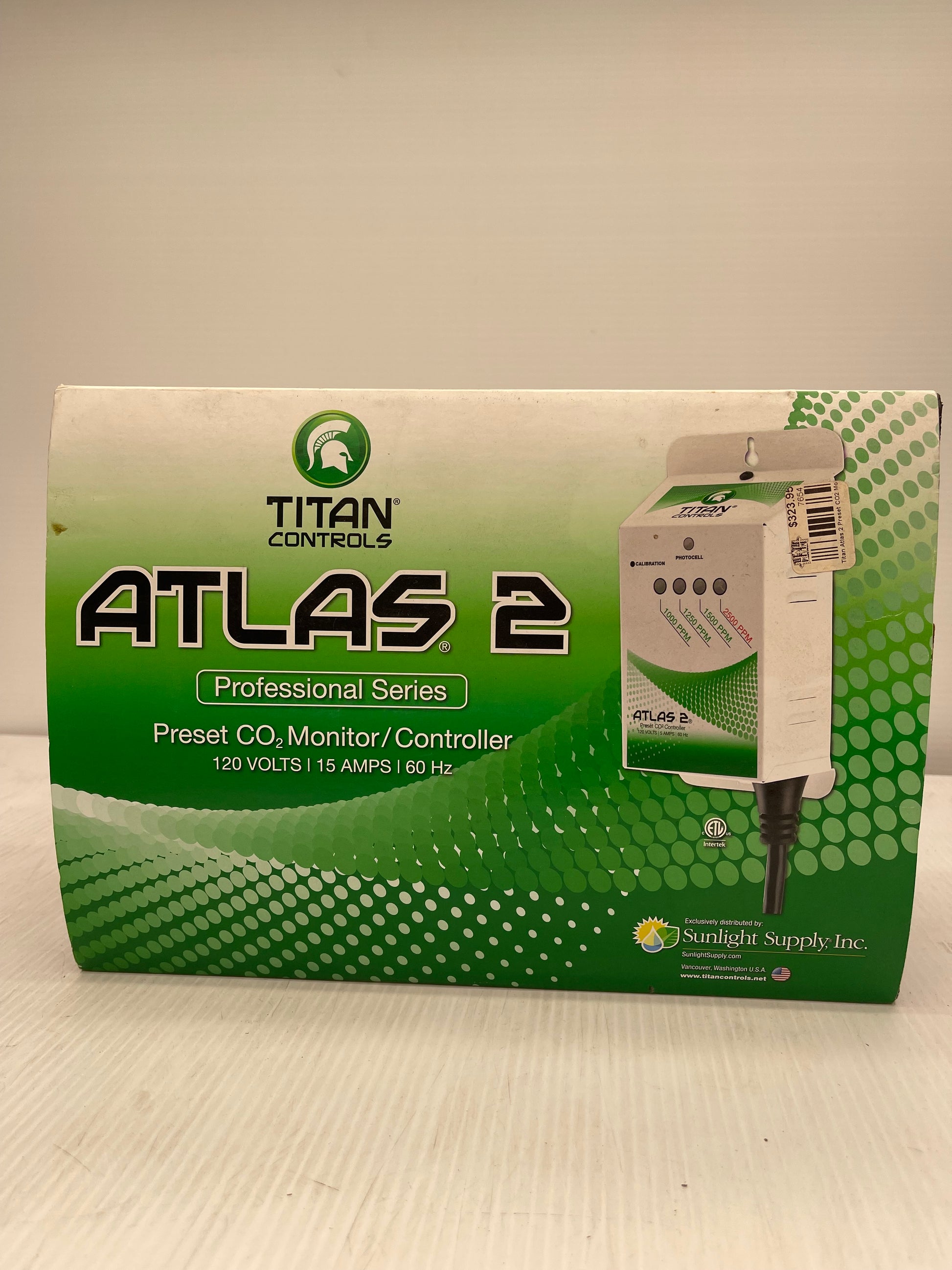 Titan Controls® Atlas® 2 - Preset CO2 Monitor/Controller Preset CO2 control at 1500 PPM. Built-in self-calibration feature. Easiest to use CO2 controller on the market. Simply plug in your CO2 generator or regulator and you are ready to go. Built-in photocell allows CO2 enrichment only during daylight hours. Durable powder-coated steel enclosure. 15 Amps maximum/120 V/ 60 Hz. Patent No. D657,748.